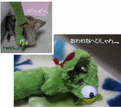 2匹で引っ張りっこをしたり、緑色の長い胴体と