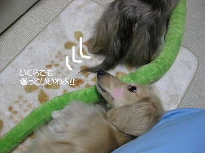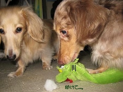 2匹で引っ張りっこをしたり、緑色の長い胴体と